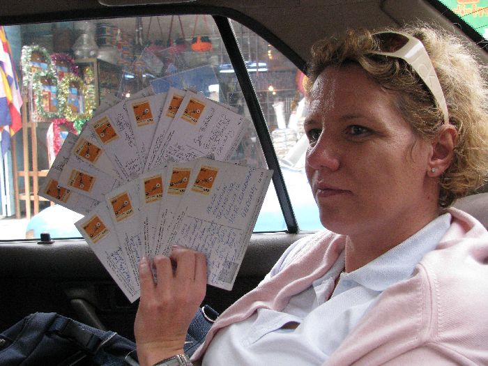 Endlich war es soweit: die langersehnten BRIEFMARKEN. Doch zu frueh gefreut, es gibt keine selbtklebende Beschichtung. Also erst mal mit Klebstoff die Dinger einweichen, dann aufkleben und stundenlang lufttrocknen lassen. Aber letztendlich sind alle Karten frankiert, eingeworfen und hoffentlich nicht auf dem Weg ins Nirwana…