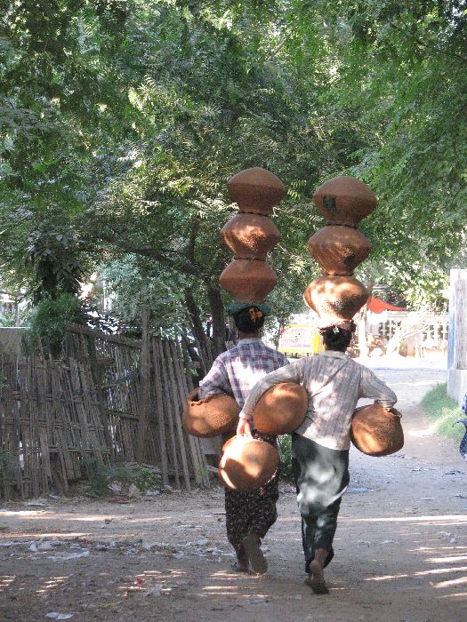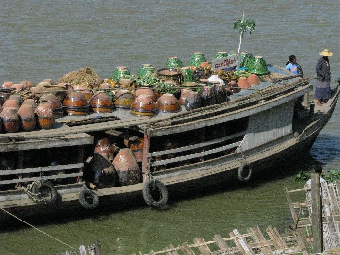 Zu nachtschlafener Stunde ging es zum Hafen und auf unser bereits bekanntes Boot. Flussabwaerts schipperten wir zunaechst noch einmal bei Sonnenaufgang vorbei an Sagaing und Inwa. Die im Morgenlicht funkelnden goldenen Daecher versetzten uns wiederum in Verzuecken. Unterwegs begnete uns der beruehmte ehemalige Rheindampfer „Road to Mandalay“, sonst war nicht viel los. Vollkommen entspannt tuckerten wir den ganzen Tag ueber den Irrawaddy entlang und erreichten nach 11 Stunden Fahrt Bagan.