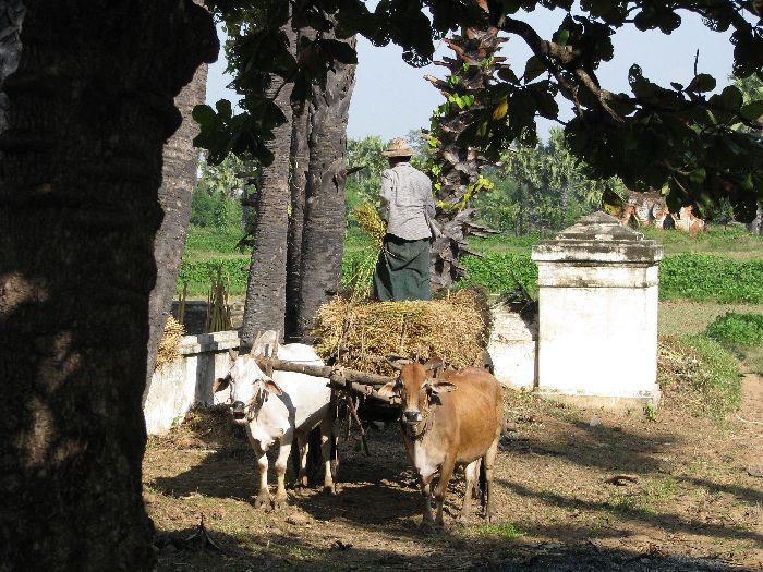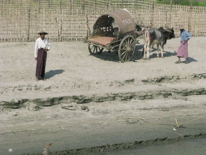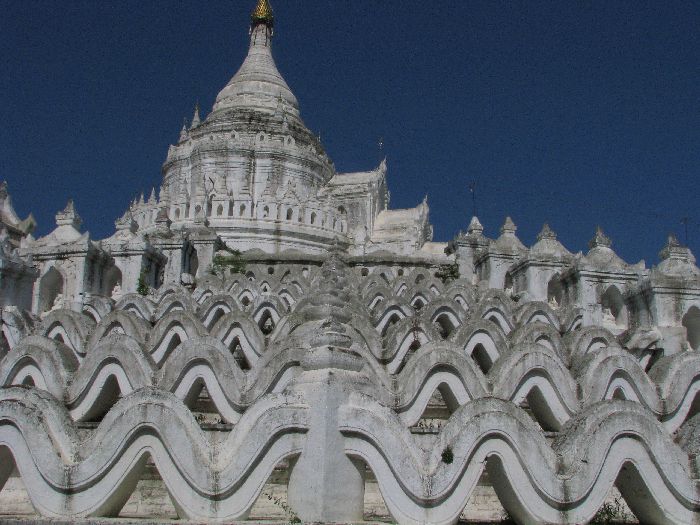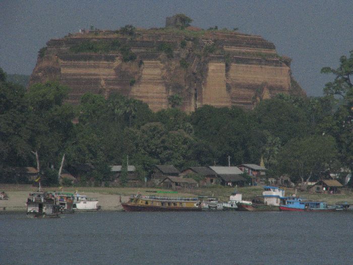 Heute fuhren wir zum ersten Mal auf dem Irrawaddy, und zwar nach Mingun. Schon von weitem konnten wir den riesigen Ziegelhaufen sehen. Hier sollte im 18. Jh. die groesste Pagode der Welt errichtet werden, leider ist es beim 50 m hohen Sockel geblieben und ein Erdbeben gab ihm den Rest. Auf ungezaehlten Stufen laesst sich die Ruine dennoch erklimmen, dafuer bietet sich von oben ein toller Ausblick. Doch nicht genug der Superlative: auch die groesste funktionstuechtige Glocke der Welt, mit einem Durchmesser von 5 m, konnten wir anschlagen – nach birmanischer Sitte 5 Mal, das bringt Glueck! Die naechsten Stufen erwarteten uns in der Myatheindan-Pagode. Auf 7 mit Wellen versehenen Terrassen, die den Weltberg Meru umschliessen, ging es hinauf. Zurueck zum Schiff ueber staubige Wege, wurden wir von Ochsen-Taxis ueberholt.