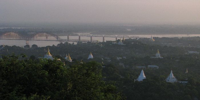 Am Ufer des Flusses kurz vor der Inwa-Bruecke konnten wir schon erahnen, welches Kleinod uns erwartet. Hunderte von goldenen Stupas ragen wie Pilze aus den gruenen Huegeln. Insgesamt mehr als 5.000 Moenche und 3.000 Nonnen sollen es sein, die hier buddhistische Einkehr halten. Besonders sehenswert war die Umin Thounzeh-Pagode mit 45 Buddhas, die im Halbrund sitzen sowie die Sun U Ponnya Shin-Pagode. Nachdem wir die Sonne ueber dem Irrawaddy untergehen sahen, ging es zum letzten Mal fuer diesen Tag Hunderte von Stufen abwaerts.