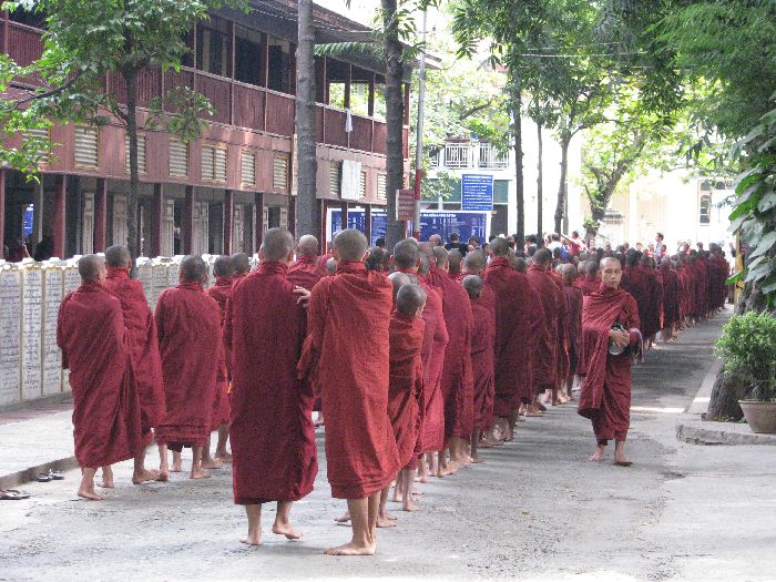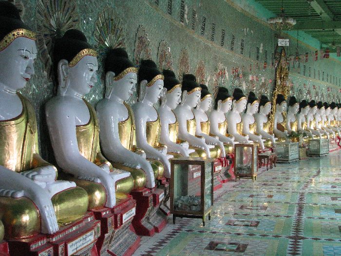 In Amarapura lernten wir an der Pahto Dawgyi Pagode, dass verwaschenes Hellblau die Modefarbe der Saison fuer Pagoden ist. Nagayon und Kloster Mahagandayon standen als Naechstes an. An letzterem fand um 10.15h ein unglaulicher Touristenzirkus statt, anlaesslich der Moenchsspeisung, peinlich!