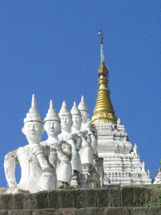 Ein Besuch beim ehemaligen Koenigspalast erwies sich als eher schaurig denn schoen; viel Wellblech, schlechte Repliken und das alles umwabert von einer Atmosphaere der Trostlosigkeit. Umso schoener das alte Teakholzkloster Shwenandaw mit grazilsten Schnitzereien.
