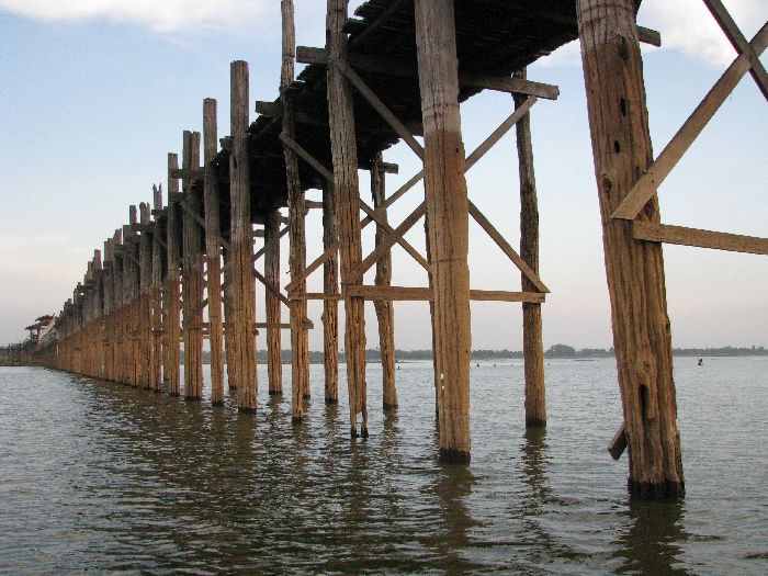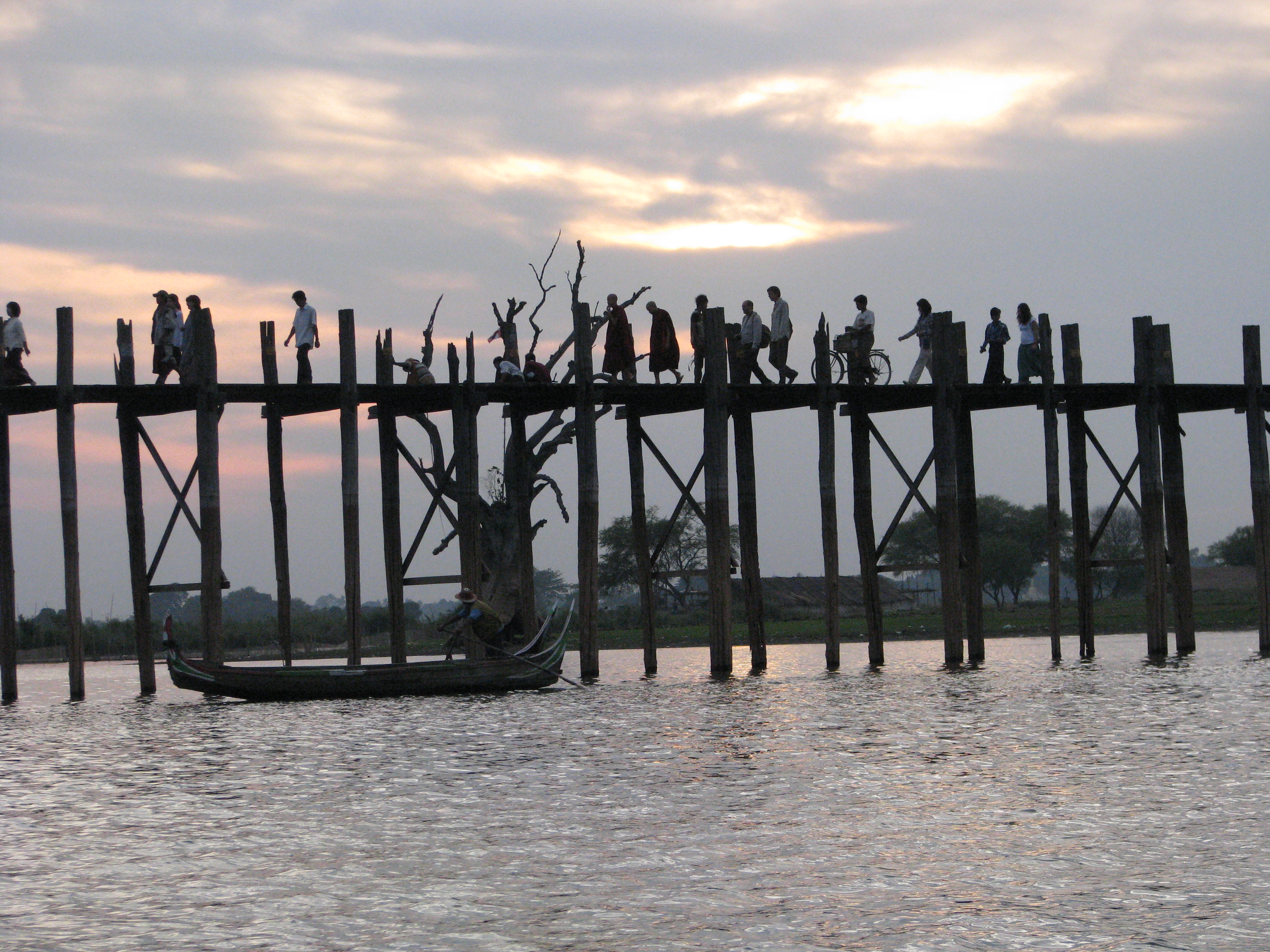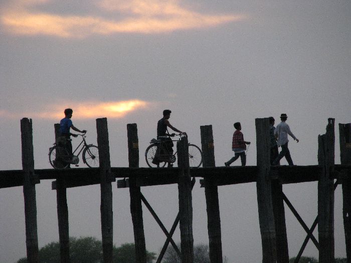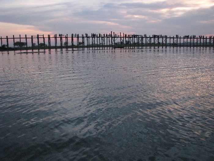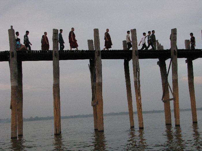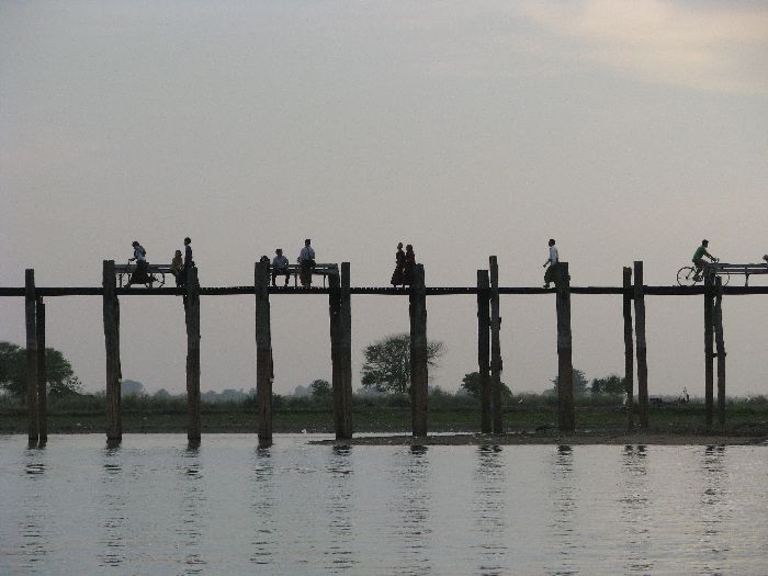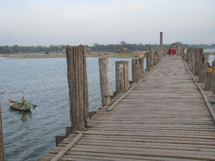 Noch nicht genug der wunderbaren Eindruecke – ein weiteres Kalendermotiv erwartet uns mit der U Bein Bruecke. Auf dieser mit 1,2 km laengsten Bruecke der Welt tummelten sich Moenche in orangeroten Roben, Maedchen auf Fahrraedern und Frauen, die meisterhaft Koerbe und Tabletts auf ihren Koepfen balancieren.
