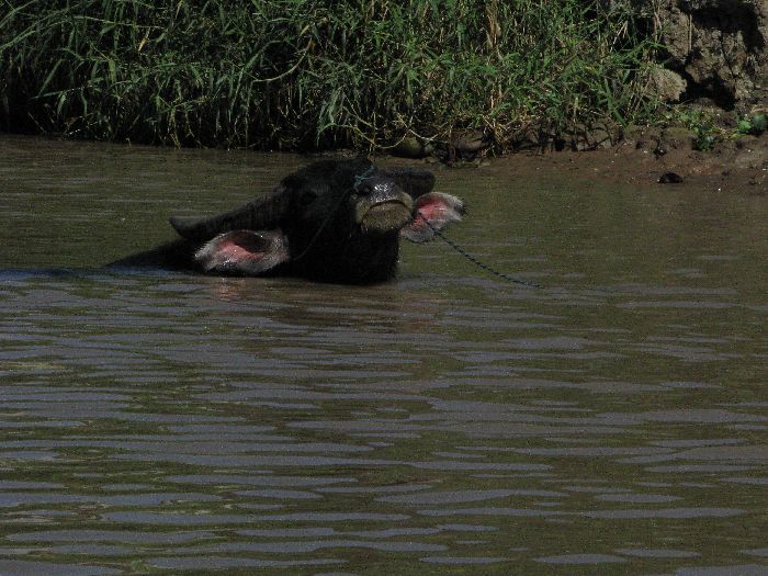 Um mit der Faehre eine Runde zu drehen, mussten wir erst mal beim General Manager vorstellig werden. Nachdem von der Passnummer bis zur Schuhgroesse alle Details mit Durchschlag notiert waren, hielten wir tatsaechlich 2 gueltige Hin- und Rueckfahrtickets in der Hand – nur dumm, dass sie keiner sehen wollte, Auf dem Boot ging es eher zu wie auf einem orientalischen Basar, staendig wurden Eier in vielfaeltigsten Alterungsstufen angeboten, neben Betelblaettern und diversem anderem Tinnef.