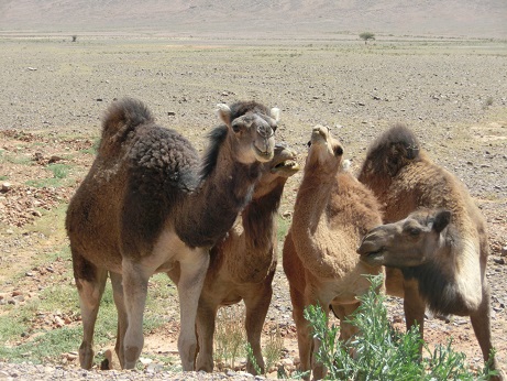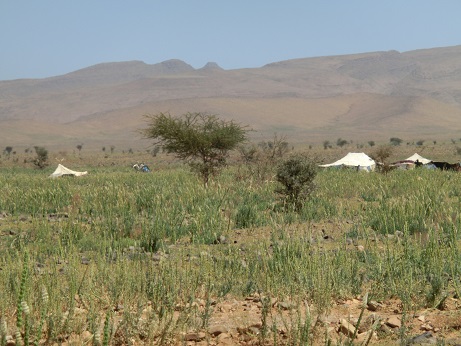 Nach einer einstündigen Fahrt durchs Nirwana fanden wir tatsächlich eine funktionierende Tanke sowie die hilfreiche Information, dass die in der Karte eingezeichnete Piste mittlerweile zu einer asphaltierten Straße ausgebaut ist, was uns geschätzte 100 km Weg ersparte. Und so fuhren wir weiter durch die erstaunlich grüne Ebene und erfreuten uns an verschiedenfarbigen Blümchen, deren Namen wir mal wieder nicht kennen. Am Rande der unglaublich breiten Wadis (Trockenflusstälern) hatten Nomaden ihre Zelte aufgeschlagen und ihre Ziegen- und Kamelherden weideten am frischen Grün.