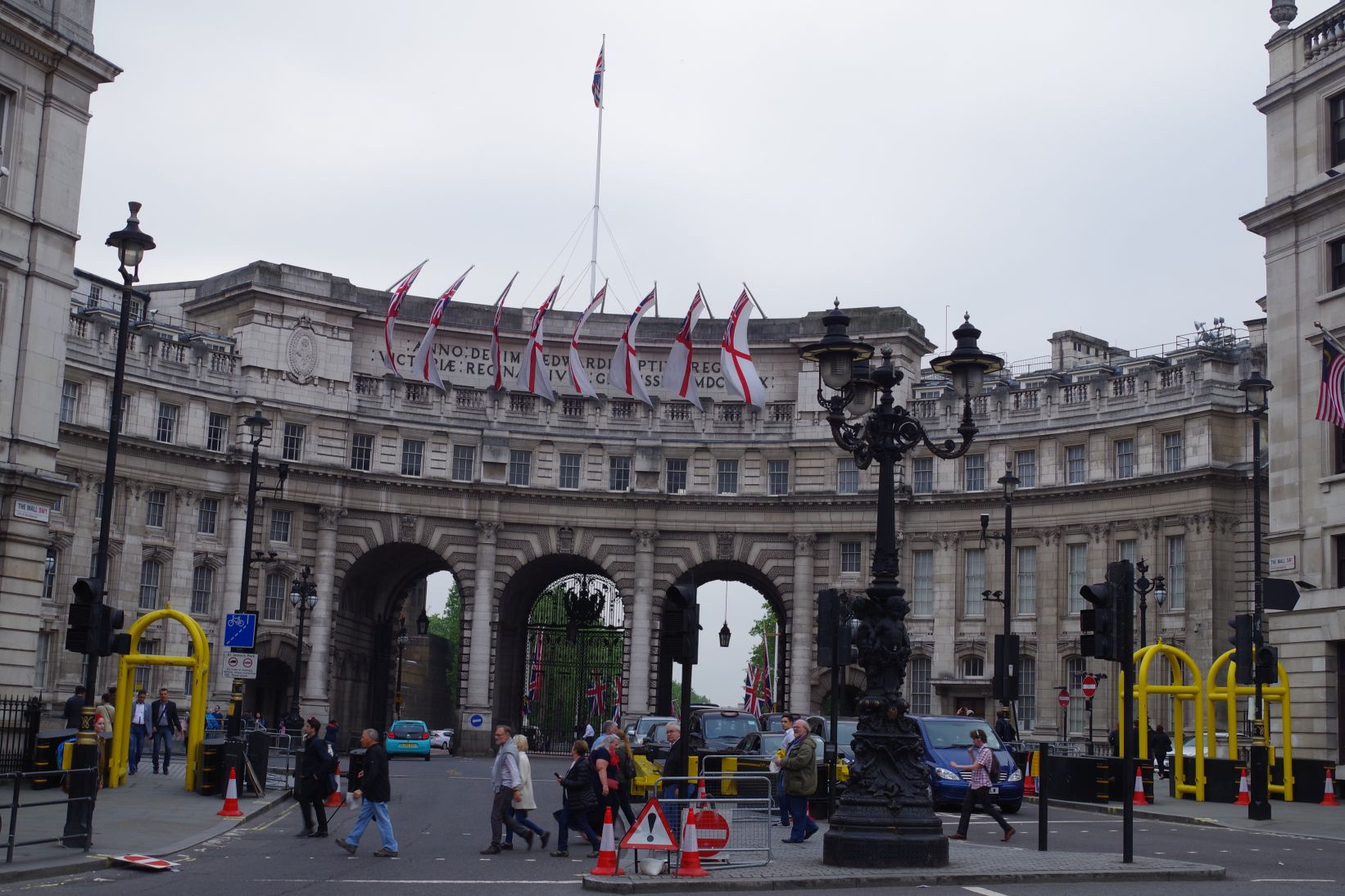 Entlang der Mall bis zum Buckingham Palace ist beflaggt und mit Guards bewacht. Wir konnten nicht herausfinden, wer heute in der Kutsche saß. Wir pilgern zum Buckingham Palace und die Queen scheint heute nicht zuhause zu sein, Trotzdem ist es dort ziemlich voll.